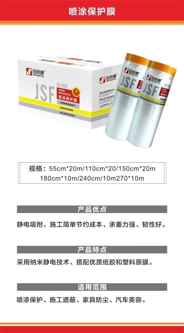 金師傅油漆噴涂保護膜全面上市,采用靜電技術(shù),塑料原膜,吸附能力強,韌性好,承重力強,是適用于各行業(yè)大面積噴涂之前使用的專業(yè)遮蔽材料。