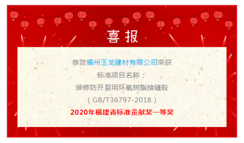 恭賀福州玉龍建材有限公司榮獲標準項目名稱:裝修防開裂用環(huán)氧樹脂接縫膠(GB/T36797-2018)2020年福建省標準貢獻獎一等獎。
