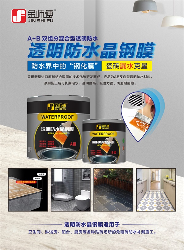 金師傅透明防水晶鋼膜采用新型進(jìn)口原料結(jié)合深厚的技術(shù)優(yōu)勢研發(fā)而成,產(chǎn)品為AB反應(yīng)型防水材料,被廣泛應(yīng)用于衛(wèi)生間、陽臺、浴室等各種貼磚場所的免砸磚防水補(bǔ)漏施工。