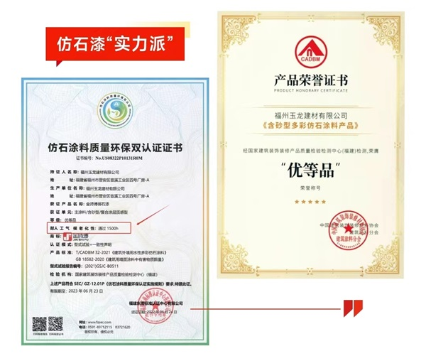 憑借強(qiáng)大的產(chǎn)品實力,金師傅御石漆先后斬獲仿石涂料行業(yè)國家“仿石涂料質(zhì)量與環(huán)保雙認(rèn)證”證書并榮膺“優(yōu)等品”等多項榮譽(yù)稱號。這些都將成為支撐銷售的有力武器,助力加盟伙伴更好地開拓市場、成交業(yè)績。