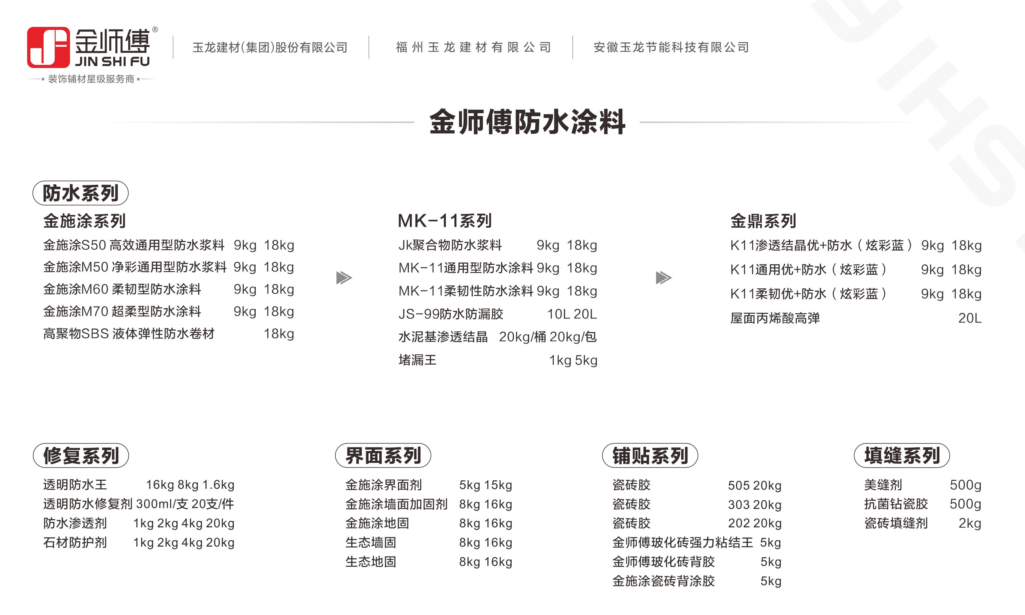 市面上防水材料大多太雜,每個材料廠家都有自己的名稱以及產(chǎn)品編號,和石材、金屬等一樣,很容易把用戶給繞暈,迷迷糊糊不知道怎么選擇材料,不知道什么場合適用什么材料。那么這次,來帶你輕松了解玉龍建材金師傅關(guān)于防水這一塊的產(chǎn)品體系。