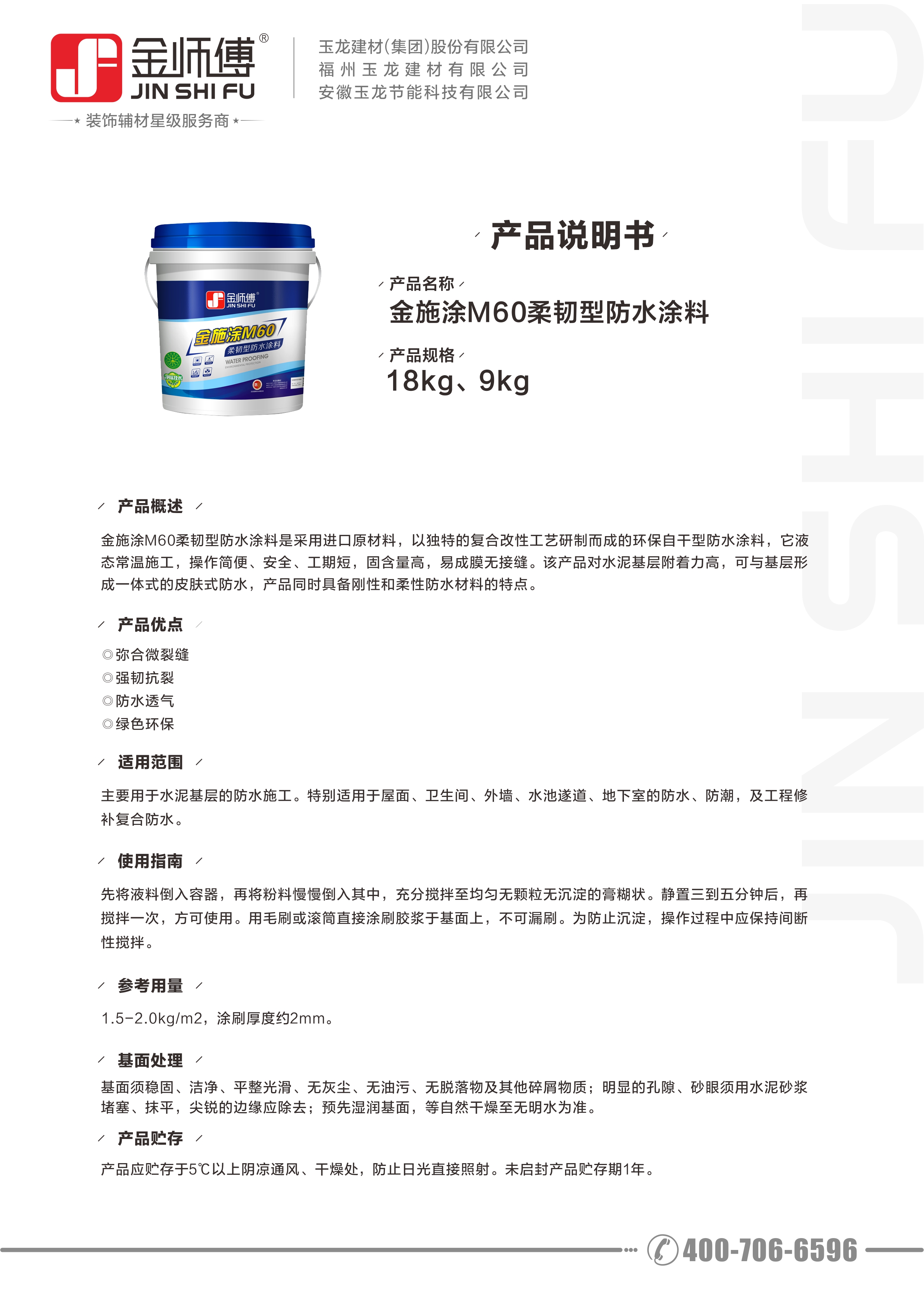 產(chǎn)品名稱:金施涂M60柔韌型防水涂料